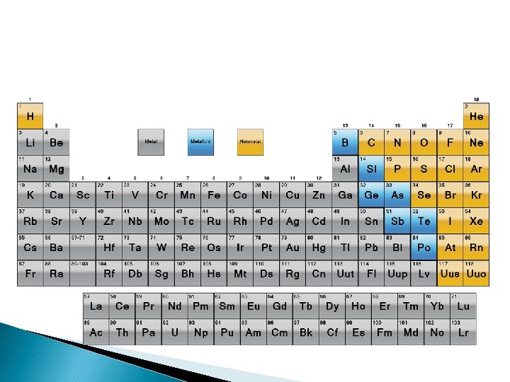 Classification of Elements Metals ◦ On the left side ◦ Make up ¾ of all elements ◦ Malleable, Ductile, Conduct electricity, form positive ions. Non. Metals ◦ On the Right side ◦ Dull, Brittle, Insulators, form negative ions Metalloids (Semimetals) ◦ Found along the staircase between metals and nonmetals, have properties of both.