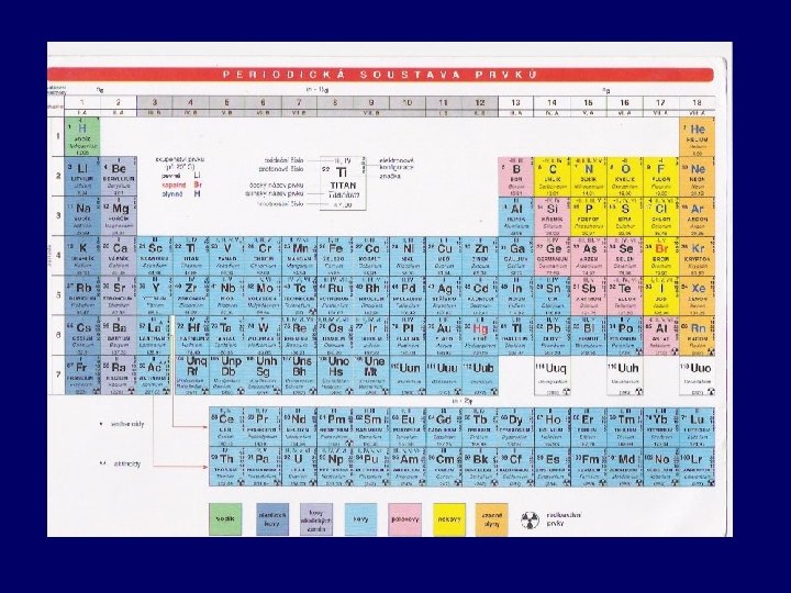 § prvky některých podskupin mají typické názvy: Ia – alkalické kovy IIa – kovy alkalických zemin IIIa – zeminy VIIa – halogeny VIa – chalkogeny VIII vzácné plyny někdy VIII. skup. zařazení vodíku nejednotné, pro jeho kovové vlastnosti buď do čela halogenů, nebo pro jeho silně elektropozitivní povahu do I. skupiny (nejlépe volné zařazení od I do VII) § ostatní podskupiny se nazývají podle prvních prvků v jednotlivých podskupinách § skupiny v periodické soustavě se obvykle značí římskými číslicemi, jednotlivé periody číslicemi arabskými § prvky, které mají valenční elektrony pouze v podhladině S, se nazývají s-prvky. Prvky, u kterých se valenčními elektrony zaplňují podhladiny P (mají tedy valenční elektrony na podhladinách S a P), se nazývají p-prvky. § prvky, kde se elektrony zaplňují podhladiny D jsou d-prvky. Jako f-prvky označujeme lanthanoidy a aktinoidy. § prvky S a P patří mezi prvky nepřechodné. Jsou umístěny na začátku a na konci jednotlivých period. Prvky D jsou prvky přechodné, jsou umístěny ve středu jednotlivých period, prvky F jsou prvky vnitřně přechodné.