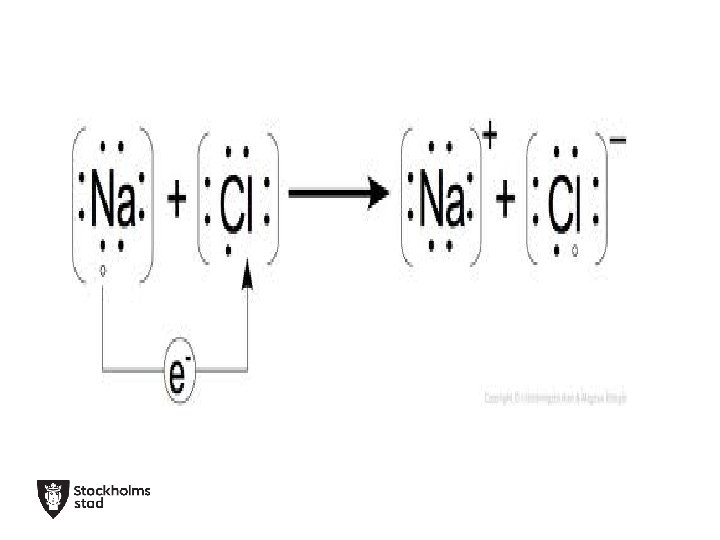 Positiva joner • Atomer med få valenselektroner (elektroner i sitt yttersta skal) kan släppa iväg de elektronerna och få en ädelgasstruktur. • Då bildas positiva joner eftersom de har fler positiva protoner i kärnan än negativt laddade elektroner i skalen. L M K L K 11 p+ Natriumatom 11 p+ Natriumjon, Na+ + 1 elektron