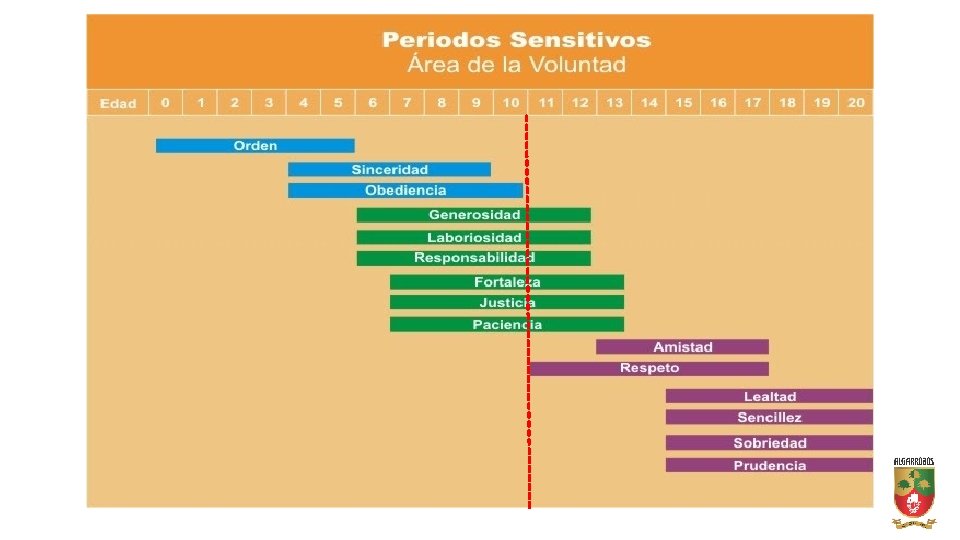 Periodo sensitivo: 11 a 15 años • • • Las reglas morales deben ahora explicar por qué. Los sentimientos necesitan justicia ahora. Ahora, la ciencia y el arte necesitan el prestigio de sus representantes. Desprecia la mediocridad y quizá sea esta la principal razón por la que experimenta un secreto desprecio de sí mismo. Ama la coherencia y manifiesta su rechazo a los adultos incoherentes volviéndose grotesco y burlón. Le preocupa el futuro, el destino del país y del mundo. Sin embargo, si vive en un entorno esperanzador, escapará al mundo de un caballero adulto. Se sueña paladín o libertador, pero, si encuentra en torno suyo un ambiente de frivolidad y de capricho, se decide pronto a abandonar las armas. El bien común, la justicia y la paz, si no encuentran un cauce accesible y objetivo, le parecerán muy pronto mera utopías. Solo el poder iluminador de los valores vividos en plenitud es capaz de moverle a una vida de generoso servicio a los demás. denis. edquen@algarrobos. edu. pe
