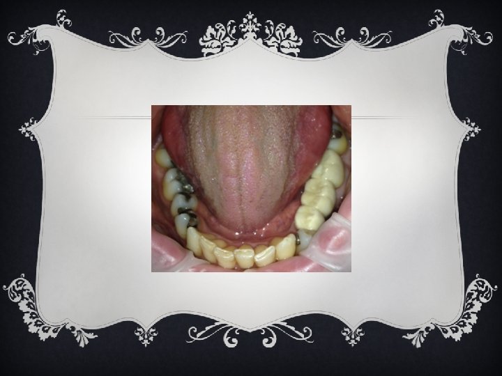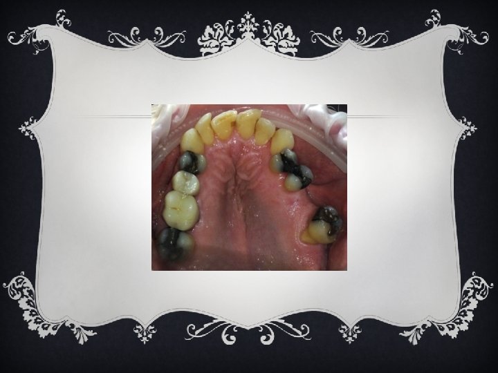 EXTRA ORAL & INTRA ORAL FINDINGS v Bilateral linea alba v Sl pronounced rugae v Sl scalloped & coated tongue v Sl maxillary right resorption of alveolar ridge v Moderate generalized attrition v Torso version #8, 9, 10, 21, 23, 28 & 29 v Linguoversion #4, 5 & 12 v Labioversion #6, 10, 11, 23 & 25 v Angles Class I molar & canine left v Angles Class I tend to II canine right v 20% overbite v Maxillary frena tag v 4 mm over jet v Amalgam stain #12 & 27 v Abfraction #4, 6, 11, 27 & 28