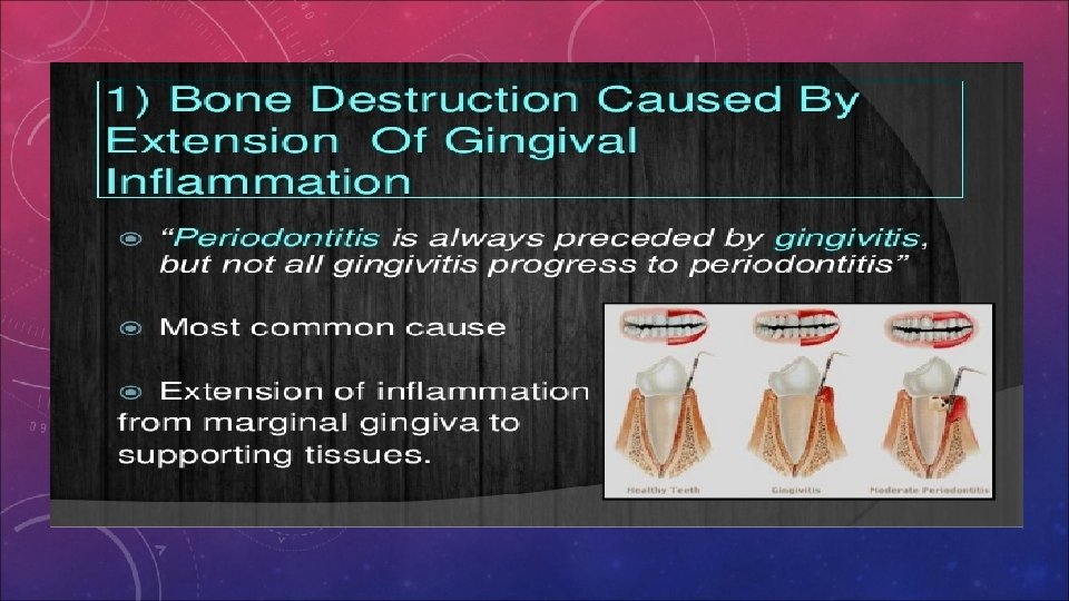 WHAT IS PERIODONTITIS? • Untreated gingivitis can advance to periodontitis. With time, plaque can spread and grow below the gum line. Gums separate from the teeth, forming pockets (spaces between the teeth and gums) that become infected. As the disease progresses, the pockets deepen, and more gum tissue and bone are destroyed. This destruction could be in horizontal or vertical pattern. This destructive process has very mild symptoms. Eventually, teeth can become loose and may have to be removed.