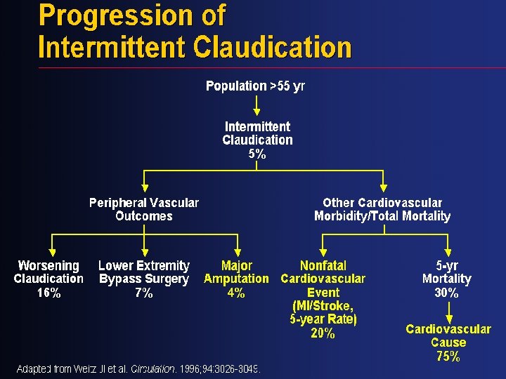 Natural History of PAD Age > 50 years Cardiovascular Morbidity / Mortality Limb Morbidity Stable Claudication 70 -80% Worsening Claudication 10 -20% Critical Limb Ischemia Nonfatal CV Events 20% Mortality 15 -30% 1 -2% CV Causes 75% Non CV Causes 25%