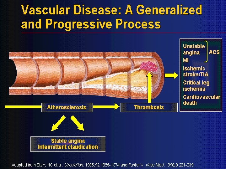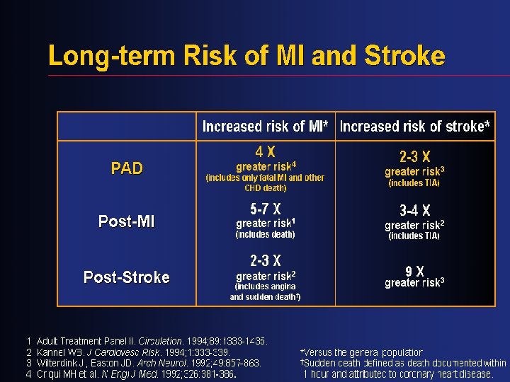 Risk of a Second Vascular Event Increased risk vs general population (%) Original event Myocardial infarction Stroke Myocardial infarction 5– 7 x greater risk 1 3– 4 x greater risk 2 (includes death) (includes TIA) 2– 3 x greater risk 2 9 x greater risk 3 Stroke (includes angina and sudden death*) Peripheral arterial disease 4 x greater risk 4 2– 3 x greater risk 3 (includes only fatal MI and other CHD death†) (includes TIA) *Sudden death defined as death documented within 1 hour and attributed to coronary heart disease (CHD) †Includes only fatal MI and other CHD death; does not include non-fatal MI 1. Adult Treatment Panel II. Circulation 1994; 89: 1333– 63. 2. Kannel WB. J Cardiovasc Risk 1994; 1: 333– 9. 3. Wilterdink JI, Easton JD. Arch Neurol 1992; 49: 857– 63. 4. Criqui MH et al. N Engl J Med 1992; 326: 381– 6.