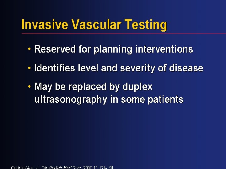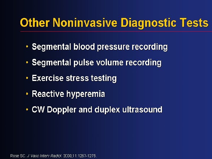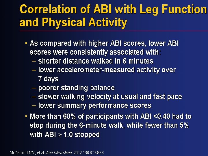 Ankle-Brachial Index Values and Clinical Classification Clinical Presentation Normal Ankle-Brachial Index > 0. 90 Claudication 0. 50 -0. 90 Rest pain 0. 21 -0. 49 Tissue loss < 0. 20 Values >1. 25 falsely elevated; commonly seen in diabetics Am J Cardiol 2001; 87 (suppl): 3 D-13 D NEJM 2001; 344: 1608 -1621