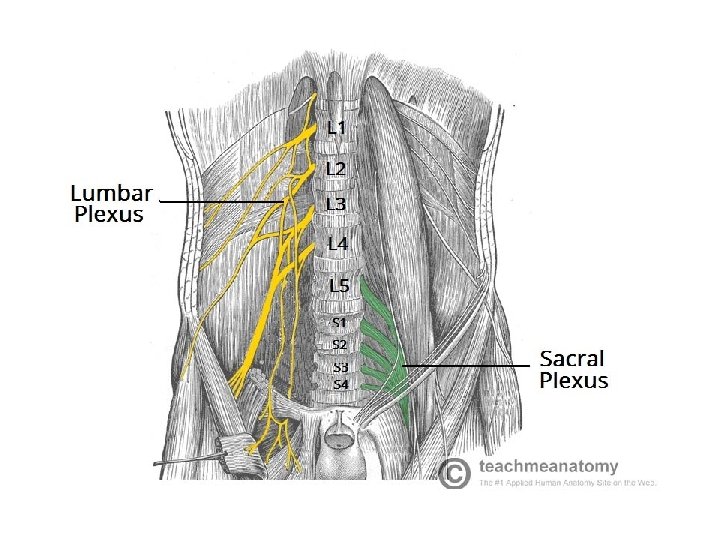 Lumbar plexus • • The lumbar plexus comprises the bundle of nerves which control movement and sensation in the lower extremities. The nerve roots exit the spine at L 1 -5 and S 1 -2. They further branch to form several nerves that descend from the plexus down the thigh and leg into the foot. Only nerves roots and branches, no trunks or cords like the brachial plexus The major branches are the lateral femoral cutaneous, femoral, obturator, and sciatic nerves providing sensation to the medial, lateral and anterior aspects of the thigh.
