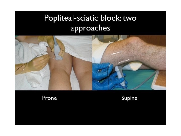 Popliteal Sciatic Block • Pt. is positioned in the prone position or in a modified exaggerated lateral position with the leg to be blocked uppermost and flexed at the knee touching the bed and the underlying leg straight. • Advantages are improved calf tourniquet tolerance and an immobile foot. • Complications may be persistent foot drop with potential pressure necrosis
