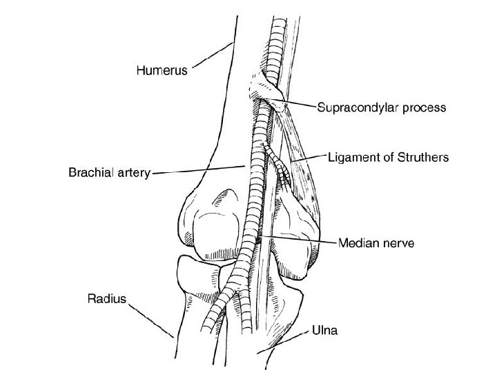 Pronator Syndrome • Median nerve compression at arm/forearm (5 potential sites of compression) • Symptoms → – Aching pain over proximal volar forearm – sensory symptoms → palmar cutaneous branch – Lack of nigh pain