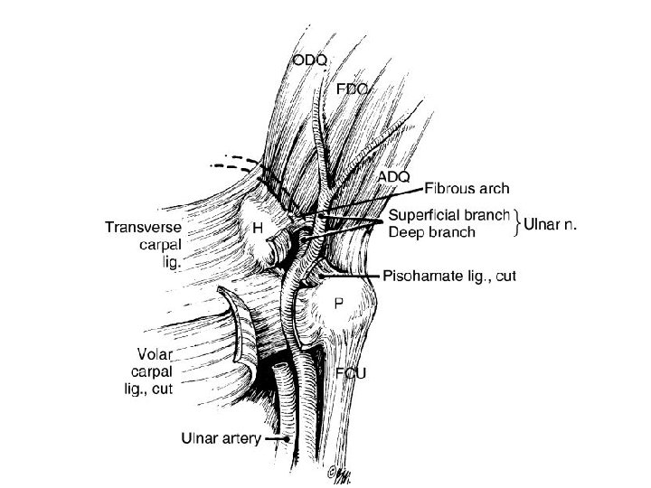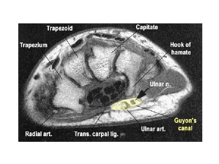 Ulnar Tunnel Syndrome • Compression neuropathy of ulnar nerve in the Guyon canal • Causes: – ganglion cyst : 80% of nontraumatic causes – hook-of-hamate nonunion – ulnar artery thrombosis or aneurysm – lipoma