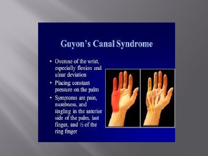 2)Proximal to Guyon`s canal : *Spared : FDP , FCU and dorsal sensation *Lost : same as above + loss of volar sensation
