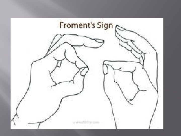 Clinical tests : Froment's sign. When the patient attempts to pinch with the thumb and index finger, the long flexor of the thumb is used to substitute for the thumb adductor, resulting in flexion of the thumb at the interphalangeal joint. This characteristic appearance is present in this patient's left hand, caused by an ulnar nerve lesion at the elbow