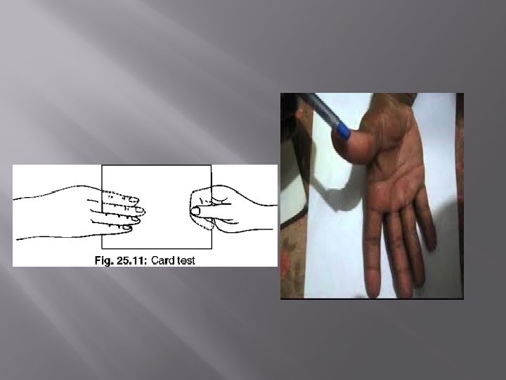 Card test Inability to hold a card or paper in between fingers due to loss of adduction by the palmar interossei Pen test Unable to touch the pen due to the loss of action of abductor pollicic brevis