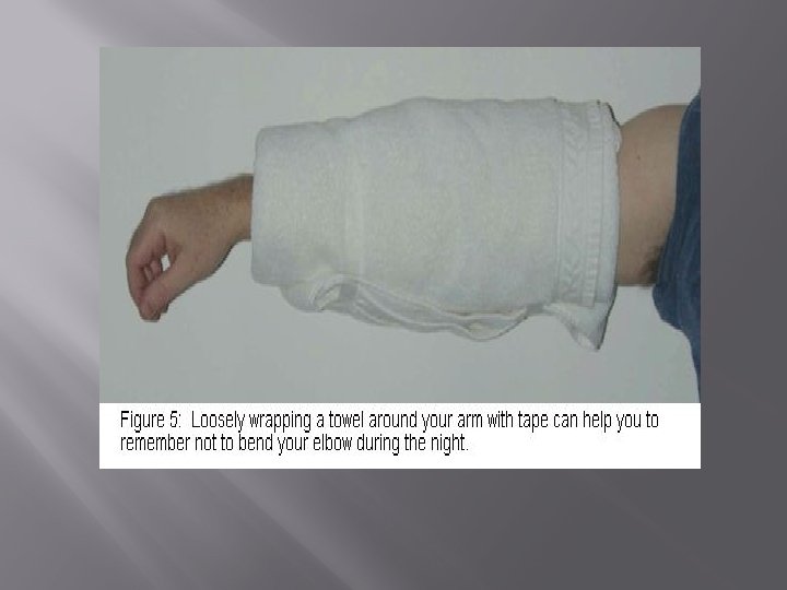 prevention 1)Avoid frequent use of the arm with the elbow bent 2)If you use a computer frequently, make sure that your chair is not too low. Do not rest the elbow on the armrest. 3)Avoid putting pressure on the inside of the arm (do not drive with the arm resting on the open window ). 4)Keep the elbow straight at night when you are sleeping (done by wrapping a towel around the straight elbow, wearing an elbow pad backwards, or using a special brace )