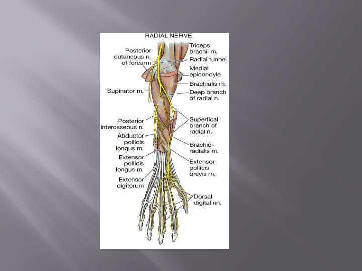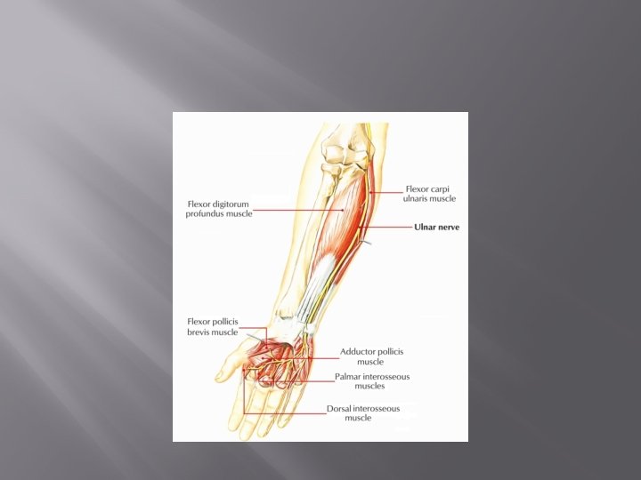Digital nerve gets injured by 2 way � **direct damage to one of the main nerve (radial, , ulnar. . median) � Or by direct damage to the hand The pateint complaint from pain, , stiffness, , loss of functions or contracture ** the main nerve responsible for motor supplying for the hand ? ? Median nerve �