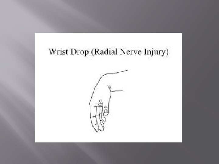 Clinical features Depend upon the site of the injury: *Lesions in or above the axilla : Paralysis and wasting of all the muscles innervated. Clinically, this is manifest as: 1)weakness of forearm extension and flexion - triceps and brachioradialis 2)wrist drop and finger drop - paralysis of the extensors of the wrist and digits 3)weakness of the long thumb abductor and extensor muscles 4)Sensory loss on the dorsum of hand forearm appropriate to the cutaneous distribution