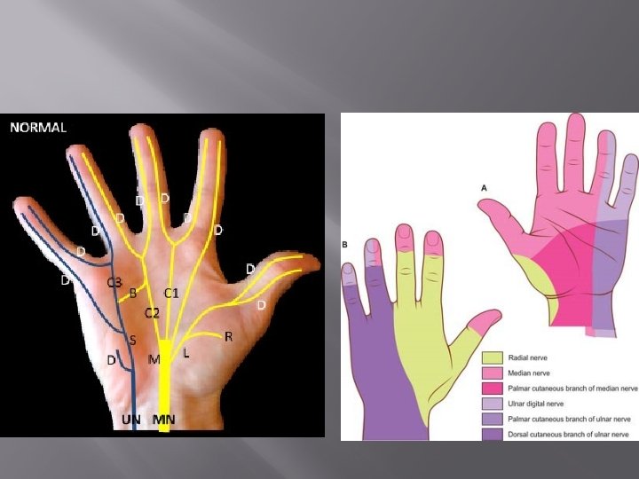 Nerves supplying the hand � Palmar aspect : 3 and ½ fingers supplied by median nerve , , , 1 and ½ fingers supplied by ulnar nerve � Dorsal aspect : more than 50% supplied by radial nerve , , , the rest by ulnar and some by median nerve Palmar digital nerves may refer to; � � Common palmar digital nerves of median nerve � Common palmar digital nerves of ulnar nerve � Proper palmar digital nerves of median nerve � Proper palmar digital nerves of ulnar nerve Dorsal digital nerves may refer to: Dorsal digital nerves of radial nerve Dorsal digital nerves of ulnar nerve �