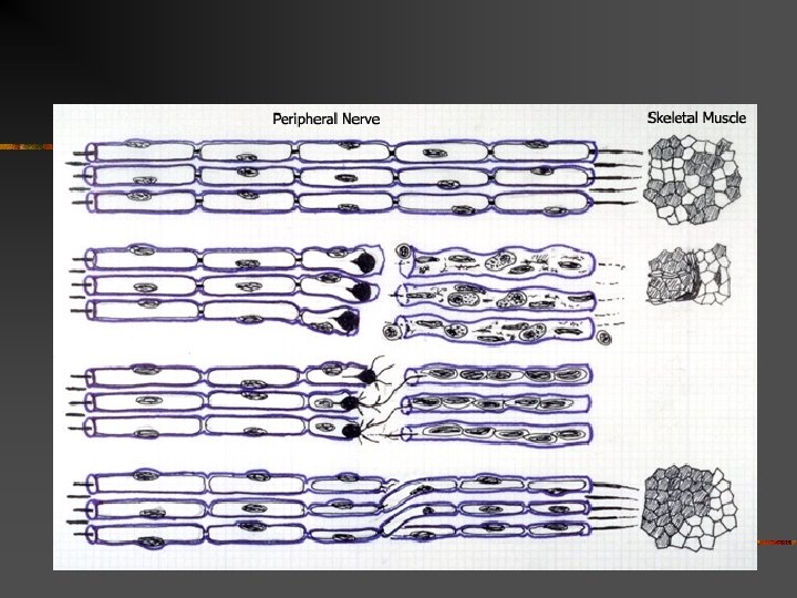 Wallerian degeneration Much more prominent after focal injury The distal part of the axon will initially degenerate Sprouting axonal branches from the proximal part (axonal regeneration 1 mm/day) Reestablishing contact with the muscle fibers