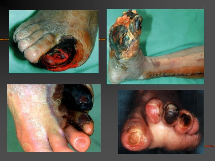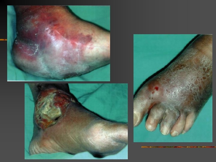 Diabetic foot n n n Joint and tegumentary lesions in patients with neuropathy and/or peripheral vascular disease 40 -60% of non traumatic amputations 30 -50% of amputees will repeat the procedure for the opposite limb during the next 1 -3 years. Motor neuropathy Sensory neuropathy Autonomic neuropathy - shape changess of foot - overcharging of pressure points - repeated microtrauma - lack of pain -Not using the defense mechanisms - altered skin reaction mechanisms -Altered skin mycrocirculation Ulcerations