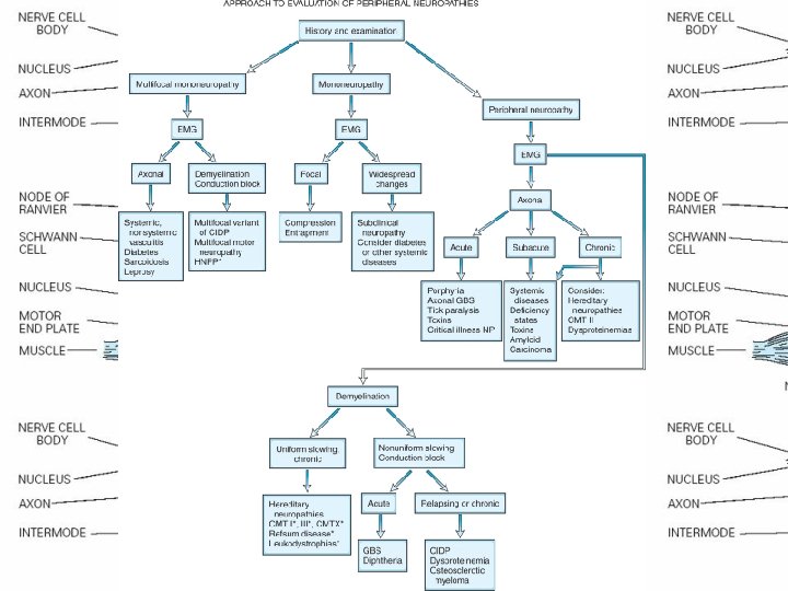 • D. Pathological and electrophysiological criteria: • 1. Demyelinating disease vs Axonopathy • 2. Wallerian degeneration - trauma • 3. Dying back neuropathy - toxic, metabolic • E. Etiology: • Metabolic, immune mediated, toxic, vasculitis, dysproteinemic, inherited, Nutritional deficiency •
