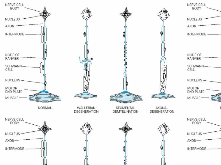 Pathological Process • (1) Wallerian degeneration, which is the response to axonal interruption; • (2) Axonal degeneration or axonopathy; • (3) Primary neuronal degeneration or neuronopathy; • (4) Segmental demyelination