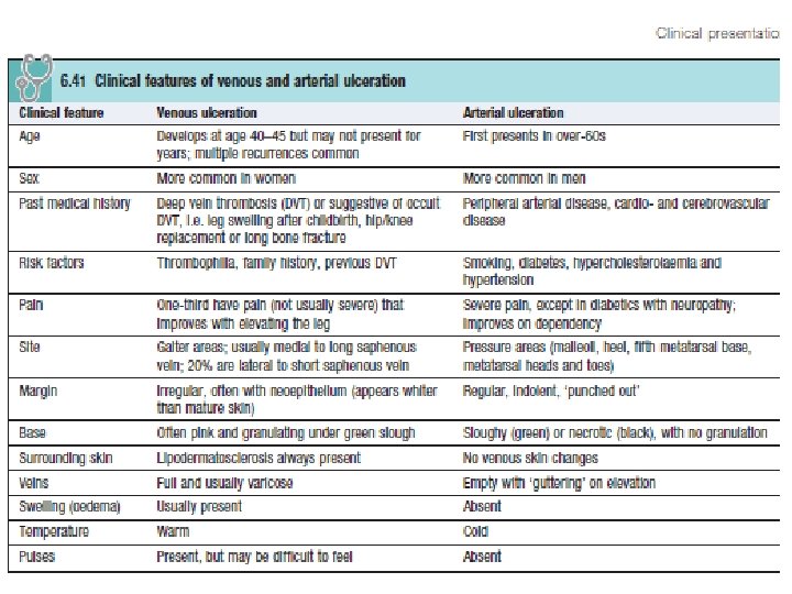 Venous Ulceration • Chronic venous ulceration usually affects the medial aspect, is shallow; is pink (granulation tissue) or yellow/ green (slough); has an irregular margin; and is always associated with other skin changes of chronic venous insufficiency (varicose eczema, lipodermatosclerosis)