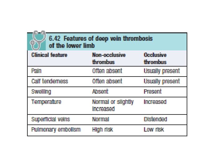 Deep Venous Thrombosis (DVT) in Legs • The clinical features of DVT depend upon its site, extent and whether it is occlusive or not • The so-called ‘classical’ features of DVT relate to well-established occlusive thrombus. • Most patients who die from pulmonary embolism have non-occlusive thrombosis and the leg is normal on clinical examination.