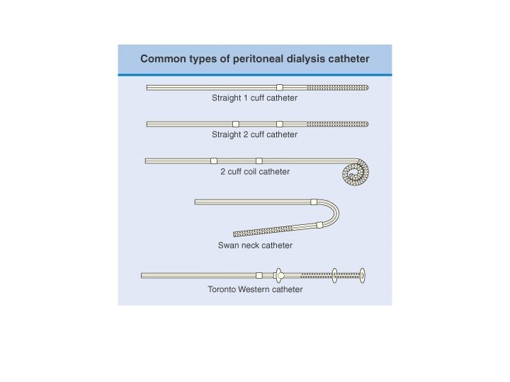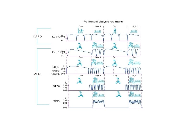 Types of peritoneal dialysis • Manual – CAPD-Continuous ambulatory peritoneal dialysis • Automated – CCPD-Continuous cyclic peritoneal dialysis – NIPD-Nocturnal intermittent peritoneal dialysis – TDP-Tidal peritoneal dialysis