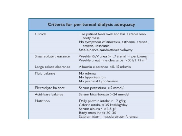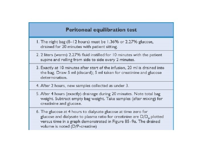 Composition of peritoneal dialysis fluid Sodium(mmol/L) 132 -134 Potasium(mmol/L) 0 -2 Calcium(mmol/L) 1. 0 -1. 75 Magnesium(mmol/L) 0. 25 -0. 75 Chloride(mmol/L) 95 -106 Lactate(mmol/L) 35 -40 Bicarbonate(mmol/L) 34 Bicarbonate/lactate 25/15 Glucose(g/dl) 1. 36 -4. 25 lcodextrin(g/dl) 7. 5 Amino acids(g/dl) 1. 1