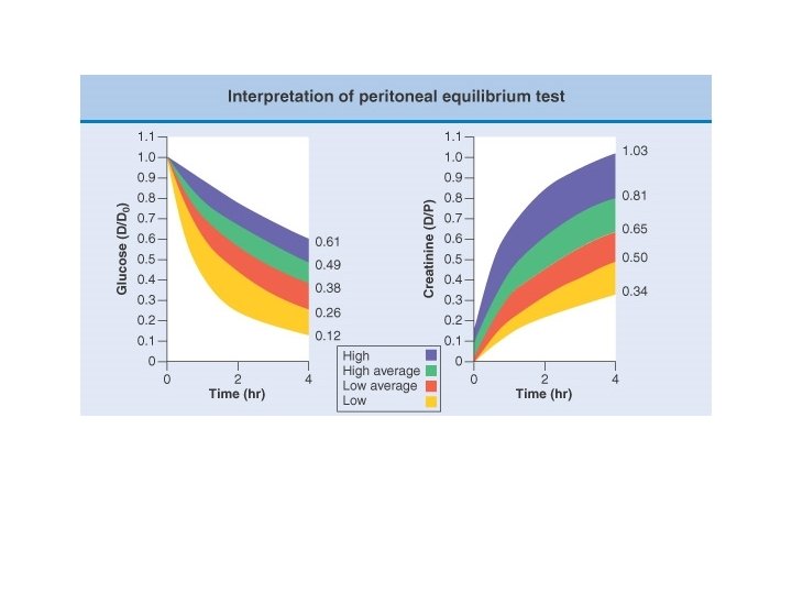 Peritoneal transport assessment • PET test – Concentration of creatinine in dialysis solution at four hrs – Concentration of creatinine in plasma at same time – Ratio of dialysate creatinine to plasma creatinine is calculated – Subject is classified into different transporter group