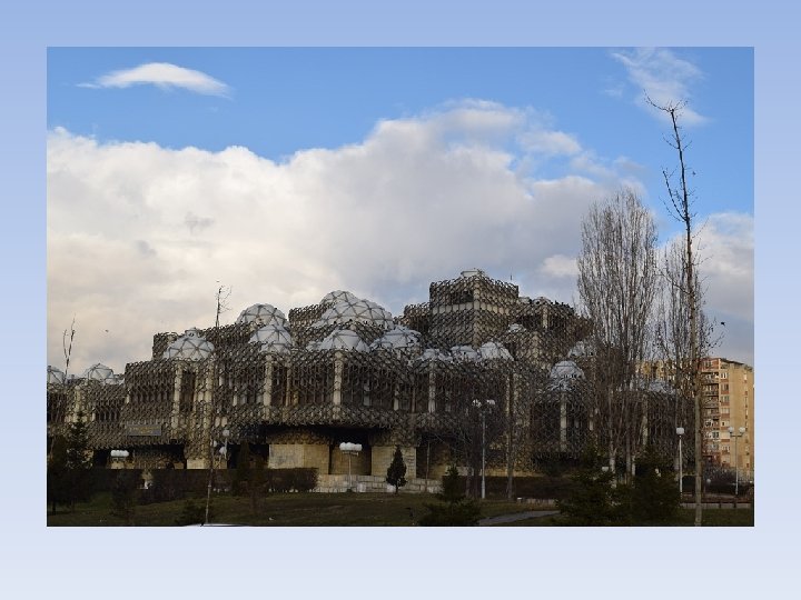 • E ndërtuar në vitin 1974 dhe e dizajnuar nga arkitekti kroat Andrija Mutnjakovic, biblioteka si tërësi arkitekturore paraqet një kombinim të kubeve dhe kupolave dhe i takon tipit të arkitekturës të “regjionalizmit të ri”. Biblioteka Kombëtare Universitare e Kosovës në vitin 1982 (e njohur në atë kohë si Biblioteka Popullore dhe Universitare e Kosovës) e fillon veprimtarinë e vet në këtë ndërtesë. Ndërtesa është katërkatëshe me sipërfaqe prej 16. 500 m², prej të cilave 13. 500 m² sipërfaqe të shfrytëzueshme. Në pikëpamjen kompozicionale biblioteka veçohet si tërësi kubesh të mbështjella me membranë skeletore çeliku, e cila në kombinim me ndriçimin zenitor të realizuar përmes kupolave, krijon një sistem ndriçimi që siguron ndriçim të bollshëm dhe mbrojtje nga izolimi i tepruar. Gjithsej janë 99 kupola të ndara me segmente që i përngjajnë trurit dhe simbolikisht paraqesin dijen. Organizimi funksional është bërë në bazë të përvojave të bibliotekave bashkëkohore. Biblioteka ka salla të leximit, sallën e periodikut, sallat e fondeve të veçanta dhe sallat, hapësirat për laboratorët e konservimit të librit, foto-laboratorin, libër-lidhëtoren, depot dhe hapësirat administrative. Sallat e leximit janë të ndara në kate: kati i parë – dy salla të mëdha për 400 lexues, kati i dytë – sallat specialistike, në katin e tretë dhe të katërtin janë sallat për punëtorët shkencorë. Depoja e librit është e vendosur në dy katet nëntokësore. Biblioteka ka dy amfiteatro, një me 150 + 40 ulëse dhe një me 75 ulëse. Biblioteka transportin e librave e ka të mekanizuar, ndërsa hapësirat e skedarëve i ka në afërsi me të gjitha sallat e leximit. Biblioteka tani funksionon, por ka nevojë për modernizim të transportit të librave, digjitalizim të skedarëve dhe sallave të leximit si dhe intervenime të tjera.