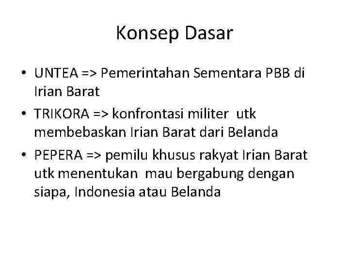 Konsep Dasar • UNTEA => Pemerintahan Sementara PBB di Irian Barat • TRIKORA => konfrontasi militer utk membebaskan Irian Barat dari Belanda • PEPERA => pemilu khusus rakyat Irian Barat utk menentukan mau bergabung dengan siapa, Indonesia atau Belanda