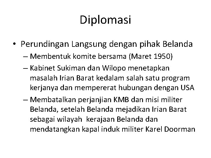 Diplomasi • Perundingan Langsung dengan pihak Belanda – Membentuk komite bersama (Maret 1950) – Kabinet Sukiman dan Wilopo menetapkan masalah Irian Barat kedalam salah satu program kerjanya dan mempererat hubungan dengan USA – Membatalkan perjanjian KMB dan misi militer Belanda, setelah Belanda mejadikan Irian Barat sebagai wilayah kerajaan Belanda dan mendatangkan kapal induk militer Karel Doorman