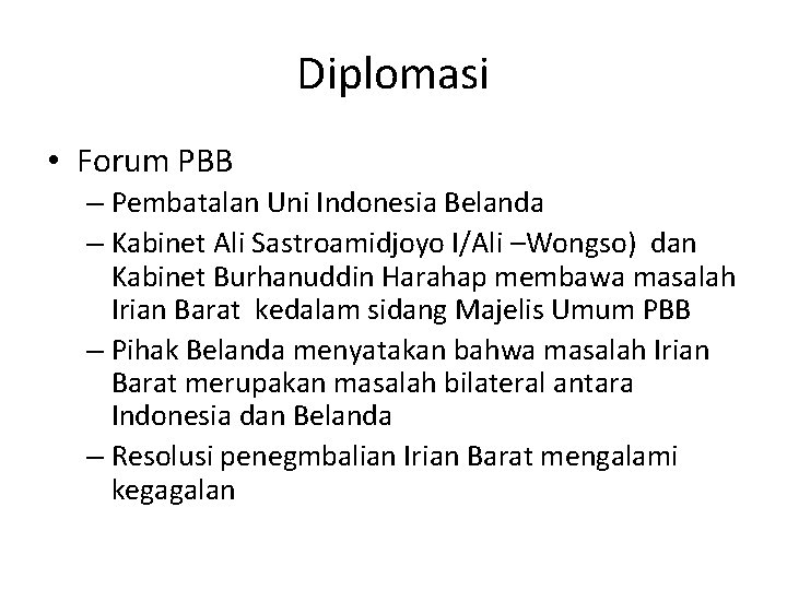 Diplomasi • Forum PBB – Pembatalan Uni Indonesia Belanda – Kabinet Ali Sastroamidjoyo I/Ali –Wongso) dan Kabinet Burhanuddin Harahap membawa masalah Irian Barat kedalam sidang Majelis Umum PBB – Pihak Belanda menyatakan bahwa masalah Irian Barat merupakan masalah bilateral antara Indonesia dan Belanda – Resolusi penegmbalian Irian Barat mengalami kegagalan