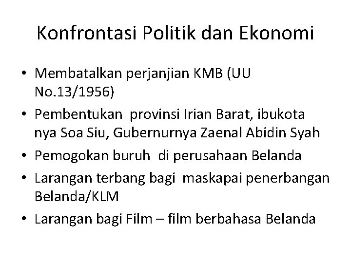 Konfrontasi Politik dan Ekonomi • Membatalkan perjanjian KMB (UU No. 13/1956) • Pembentukan provinsi Irian Barat, ibukota nya Soa Siu, Gubernurnya Zaenal Abidin Syah • Pemogokan buruh di perusahaan Belanda • Larangan terbang bagi maskapai penerbangan Belanda/KLM • Larangan bagi Film – film berbahasa Belanda