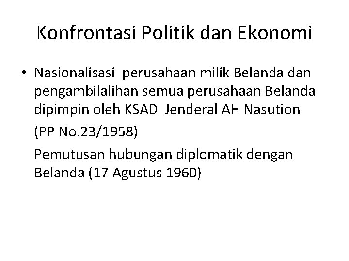 Konfrontasi Politik dan Ekonomi • Nasionalisasi perusahaan milik Belanda dan pengambilalihan semua perusahaan Belanda dipimpin oleh KSAD Jenderal AH Nasution (PP No. 23/1958) Pemutusan hubungan diplomatik dengan Belanda (17 Agustus 1960)