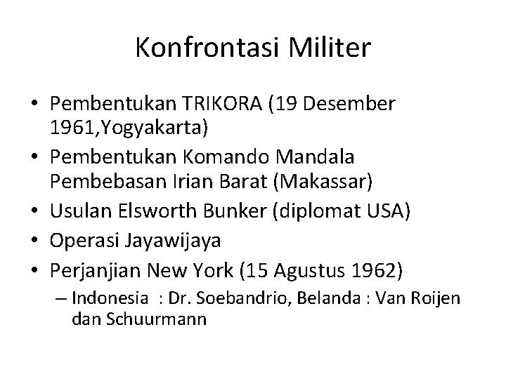 Konfrontasi Militer • Pembentukan TRIKORA (19 Desember 1961, Yogyakarta) • Pembentukan Komando Mandala Pembebasan Irian Barat (Makassar) • Usulan Elsworth Bunker (diplomat USA) • Operasi Jayawijaya • Perjanjian New York (15 Agustus 1962) – Indonesia : Dr. Soebandrio, Belanda : Van Roijen dan Schuurmann