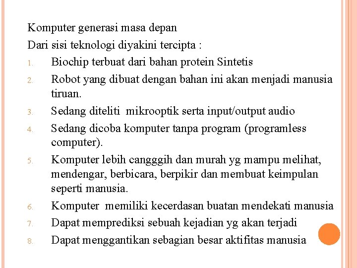 Komputer generasi masa depan Dari sisi teknologi diyakini tercipta : 1. Biochip terbuat dari bahan protein Sintetis 2. Robot yang dibuat dengan bahan ini akan menjadi manusia tiruan. 3. Sedang diteliti mikrooptik serta input/output audio 4. Sedang dicoba komputer tanpa program (programless computer). 5. Komputer lebih cangggih dan murah yg mampu melihat, mendengar, berbicara, berpikir dan membuat keimpulan seperti manusia. 6. Komputer memiliki kecerdasan buatan mendekati manusia 7. Dapat memprediksi sebuah kejadian yg akan terjadi 8. Dapat menggantikan sebagian besar aktifitas manusia