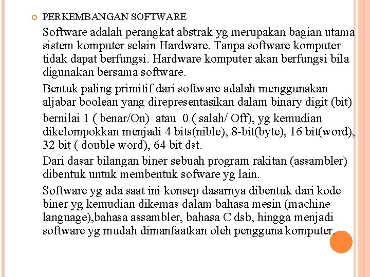 PERKEMBANGAN SOFTWARE Software adalah perangkat abstrak yg merupakan bagian utama sistem komputer selain Hardware. Tanpa software komputer tidak dapat berfungsi. Hardware komputer akan berfungsi bila digunakan bersama software. Bentuk paling primitif dari software adalah menggunakan aljabar boolean yang direpresentasikan dalam binary digit (bit) bernilai 1 ( benar/On) atau 0 ( salah/ Off), yg kemudian dikelompokkan menjadi 4 bits(nible), 8 -bit(byte), 16 bit(word), 32 bit ( double word), 64 bit dst. Dari dasar bilangan biner sebuah program rakitan (assambler) dibentuk untuk membentuk sofware yg lain. Software yg ada saat ini konsep dasarnya dibentuk dari kode biner yg kemudian dikemas dalam bahasa mesin (machine language), bahasa assambler, bahasa C dsb, hingga menjadi software yg mudah dimanfaatkan oleh pengguna komputer.