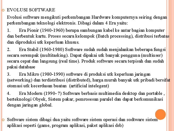 EVOLUSI SOFTWARE Evolusi software mengikuti perkembangan Hardware komputernya seiring dengan perkembangan teknologi elektronis. Dibagi dalam 4 Era yaitu: 1. Era Pionir (1940 -1960) berupa sambungan kabel ke antar bagian komputer dan berbentuk kartu. Proses secara kelompok (Batch processing), distribusi terbatas dan diproduksi utk keperluan khusus. 2. Era Stabil (1960 -1980) Software sudah menjalankan beberapa fungsi secara serempak (multitasking). Dapat dipakai utk banyak pengguna (multiuser) secara cepat dan langsung (real time). Produk software secara terpisah dan sudah pakai database 3. Era Mikro (1980 -1990) software di produksi utk keperluan jaringan (networking) dan terdistribusi (distributed), harga murah banyak utk pribadi bersifat otomasi utk kecerdasan buatan (artificial intelegent) 4. Era Modern (1990 - ? ) Software berbasis multimedia desktop dan portable , berteknologi Obyek, Sistem pakar, pemrosesan paralel dan dapat berkomunikasi dengan jaringan global. Software sistem dibagi dua yaitu software sistem operasi dan sodtware sistem aplikasi seperti (game, program aplikasi, paket aplikasi dsb)