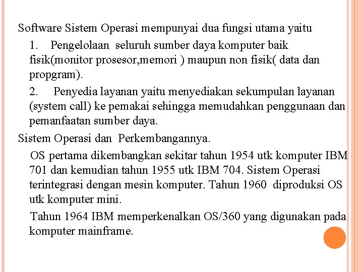 Software Sistem Operasi mempunyai dua fungsi utama yaitu 1. Pengelolaan seluruh sumber daya komputer baik fisik(monitor prosesor, memori ) maupun non fisik( data dan propgram). 2. Penyedia layanan yaitu menyediakan sekumpulan layanan (system call) ke pemakai sehingga memudahkan penggunaan dan pemanfaatan sumber daya. Sistem Operasi dan Perkembangannya. OS pertama dikembangkan sekitar tahun 1954 utk komputer IBM 701 dan kemudian tahun 1955 utk IBM 704. Sistem Operasi terintegrasi dengan mesin komputer. Tahun 1960 diproduksi OS utk komputer mini. Tahun 1964 IBM memperkenalkan OS/360 yang digunakan pada komputer mainframe.