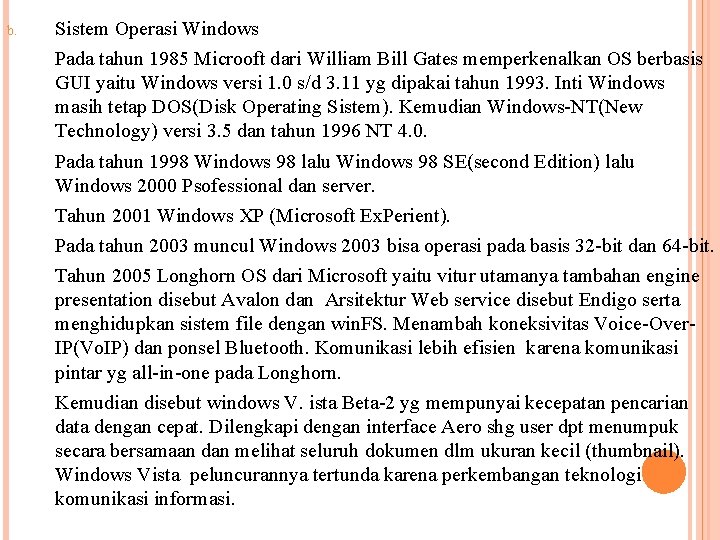 b. Sistem Operasi Windows Pada tahun 1985 Microoft dari William Bill Gates memperkenalkan OS berbasis GUI yaitu Windows versi 1. 0 s/d 3. 11 yg dipakai tahun 1993. Inti Windows masih tetap DOS(Disk Operating Sistem). Kemudian Windows-NT(New Technology) versi 3. 5 dan tahun 1996 NT 4. 0. Pada tahun 1998 Windows 98 lalu Windows 98 SE(second Edition) lalu Windows 2000 Psofessional dan server. Tahun 2001 Windows XP (Microsoft Ex. Perient). Pada tahun 2003 muncul Windows 2003 bisa operasi pada basis 32 -bit dan 64 -bit. Tahun 2005 Longhorn OS dari Microsoft yaitu vitur utamanya tambahan engine presentation disebut Avalon dan Arsitektur Web service disebut Endigo serta menghidupkan sistem file dengan win. FS. Menambah koneksivitas Voice-Over. IP(Vo. IP) dan ponsel Bluetooth. Komunikasi lebih efisien karena komunikasi pintar yg all-in-one pada Longhorn. Kemudian disebut windows V. ista Beta-2 yg mempunyai kecepatan pencarian data dengan cepat. Dilengkapi dengan interface Aero shg user dpt menumpuk secara bersamaan dan melihat seluruh dokumen dlm ukuran kecil (thumbnail). Windows Vista peluncurannya tertunda karena perkembangan teknologi komunikasi informasi.