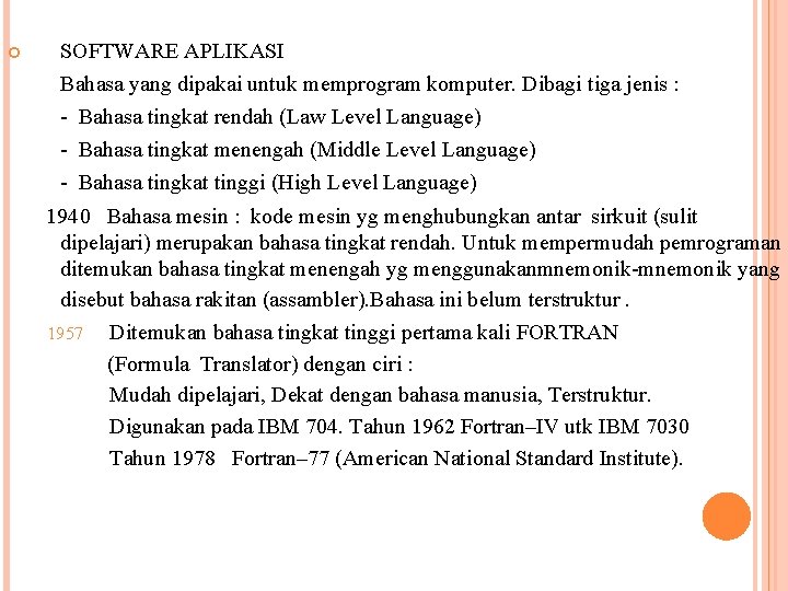 SOFTWARE APLIKASI Bahasa yang dipakai untuk memprogram komputer. Dibagi tiga jenis : - Bahasa tingkat rendah (Law Level Language) - Bahasa tingkat menengah (Middle Level Language) - Bahasa tingkat tinggi (High Level Language) 1940 Bahasa mesin : kode mesin yg menghubungkan antar sirkuit (sulit dipelajari) merupakan bahasa tingkat rendah. Untuk mempermudah pemrograman ditemukan bahasa tingkat menengah yg menggunakanmnemonik-mnemonik yang disebut bahasa rakitan (assambler). Bahasa ini belum terstruktur. 1957 Ditemukan bahasa tingkat tinggi pertama kali FORTRAN (Formula Translator) dengan ciri : Mudah dipelajari, Dekat dengan bahasa manusia, Terstruktur. Digunakan pada IBM 704. Tahun 1962 Fortran–IV utk IBM 7030 Tahun 1978 Fortran– 77 (American National Standard Institute).