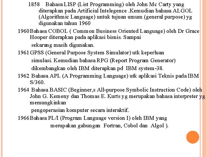 1858 Bahasa LISP (List Programming) oleh John Mc Carty yang diterapkan pada Artificial Intelegence. Kemudian bahasa ALGOL (Algorithmic Language) untuk tujuan umum (general purpose) yg digunakan tahun 1960 Bahasa COBOL ( Common Business Oriented Language) oleh Dr Grace Hooper diterapkan pada aplikasi bisnis. Sampai sekarang masih digunakan. 1961 GPSS (General Purpose System Simulator) utk keperluan simulasi. Kemudian bahasa RPG (Report Program Generator) dikembangkan oleh IBM diterapkan pd IBM system-38. 1962 Bahasa APL (A Programming Language) utk aplikasi Teknis pada IBM S/360. 1964 Bahasa BASIC (Beginner, s All-purpose Symbolic Instruction Code) oleh John G. Kemeny dan Thomas E. Kurts yg merupakan bahasa interpreter yg memungkinkan pengoperasian komputer secara interaktif. 1966 Bahasa PL/I (Program Language version I) oleh IBM yang merupakan gabungan Fortran, Cobol dan Algol ).