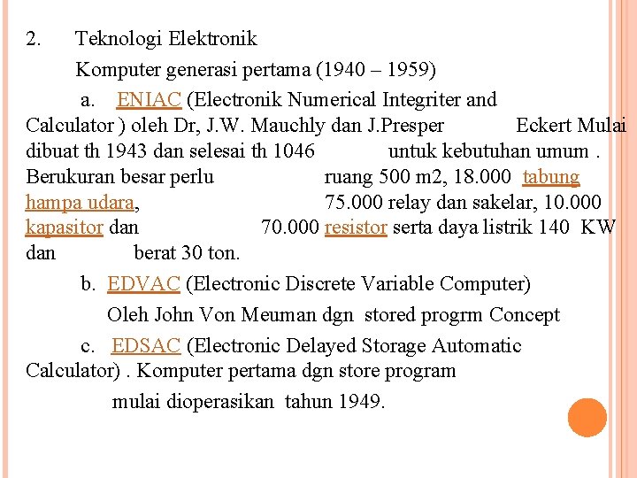 2. Teknologi Elektronik Komputer generasi pertama (1940 – 1959) a. ENIAC (Electronik Numerical Integriter and Calculator ) oleh Dr, J. W. Mauchly dan J. Presper Eckert Mulai dibuat th 1943 dan selesai th 1046 untuk kebutuhan umum. Berukuran besar perlu ruang 500 m 2, 18. 000 tabung hampa udara, 75. 000 relay dan sakelar, 10. 000 kapasitor dan 70. 000 resistor serta daya listrik 140 KW dan berat 30 ton. b. EDVAC (Electronic Discrete Variable Computer) Oleh John Von Meuman dgn stored progrm Concept c. EDSAC (Electronic Delayed Storage Automatic Calculator). Komputer pertama dgn store program mulai dioperasikan tahun 1949.