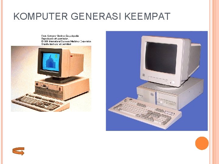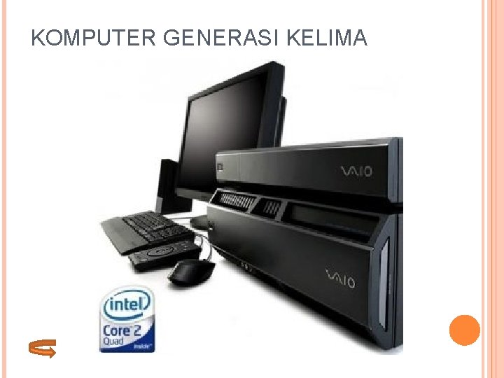 Komputer Generasi Kelima (1980 - ? ) 1. Standard PC yaitu IBM-PC (processor 8060/8080 ) dengan basis 16 Bit per satuan waktu 2. PC- compatable standard baru PC oleh perusahaan Intel dan Microsoft yg dipelopori oleh W. Bill Gate pioner standard hardware dan software dunia. 3. Teknologi pengganti chip dengan Josephson Junction yang mampu memproses triliunan operasi per detik. 4. Mampu menerjemahkan bahasa manusia dan menghemat energi komputer. Sifat ini disebut “Artificial Intelegence” 5. Berbasis pada Graphic User Interface(GUI), multimedia dan multikomunikasi 6. Berbasis pada X 86 seperti Chip 286 ( 134. 000 transistor), 386(275. 000 transistor, 486 (1. 2 juta transistor), 586 disebut pentium 1 (3. 1 transistor) melakukan 90 MIPS. 7. Tahun 2000 Intel pentium 4 arsitektur 32 bit (IA-32) 8. Tahun 2001 prosesor Itanium(Code Named Merced) arsitektur 64 -bit 9. Kecepatan tinggi, kualitas gambar bagus, multimedia, cerdas. 10. Ukuran kecil dan sederhana kemampuan yg semakin canggih.