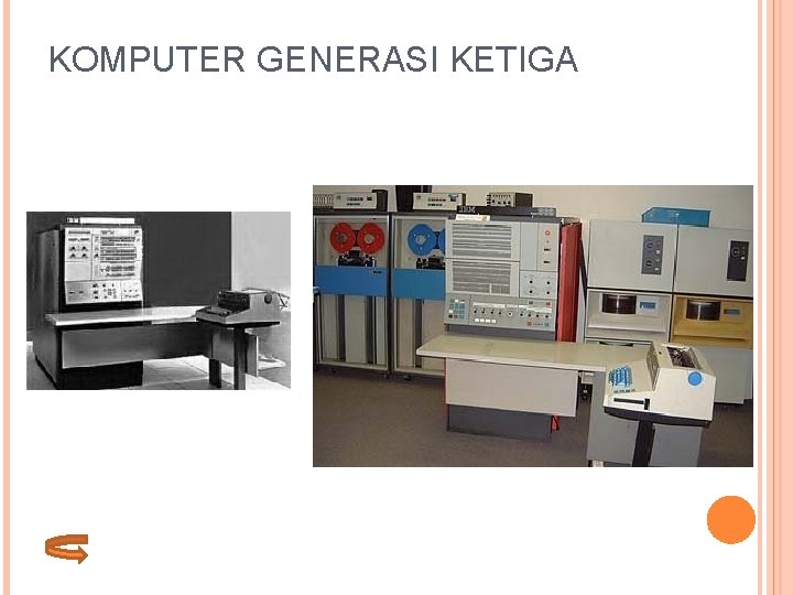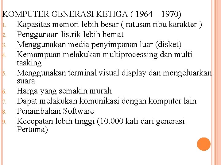 KOMPUTER GENERASI KETIGA ( 1964 – 1970) 1. Kapasitas memori lebih besar ( ratusan ribu karakter ) 2. Penggunaan listrik lebih hemat 3. Menggunakan media penyimpanan luar (disket) 4. Kemampuan melakukan multiprocessing dan multi tasking 5. Menggunakan terminal visual display dan mengeluarkan suara 6. Harga yang semakin murah 7. Dapat melakukan komunikasi dengan komputer lain 8. Penambahan Software 9. Kecepatan lebih tinggi (10. 000 kali dari generasi Pertama)