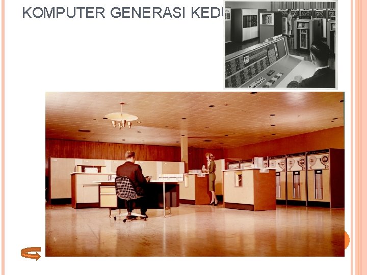 GENERASI KOMPUTER Komputer generasi pertama (1940 – 1959) 1. Komponen tabung hampa udara untuk sirkuitnya 2. Program dalam bahasa mesin 3. Memory menggunakan magnetic Core Storage 4. Magnetic tape dan magnetic disk 5. Ukuran fisik besar 6. Cepat panas 7. Proses lambat 8. Orientasi aplikasi bisnis 9. Memori kecil 10. Daya listrik besar