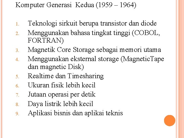 Komputer Generasi Kedua (1959 – 1964) 1. 2. 3. 4. 5. 6. 7. 8. 9. Teknologi sirkuit berupa transistor dan diode Menggunakan bahasa tingkat tinggi (COBOL, FORTRAN) Magnetik Core Storage sebagai memori utama Menggunakan eksternal storage (Magnetic. Tape dan magnetic Disk) Realtime dan Timesharing Ukuran fisik lebih kecil Jutaan operasi per detik Daya listrik lebih kecil Aplikasi bisnis dan aplikai teknis