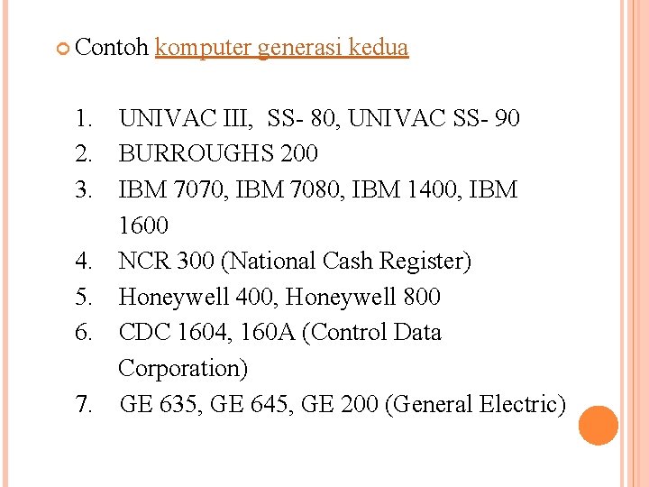 Contoh 1. 2. 3. 4. 5. 6. 7. komputer generasi kedua UNIVAC III, SS- 80, UNIVAC SS- 90 BURROUGHS 200 IBM 7070, IBM 7080, IBM 1400, IBM 1600 NCR 300 (National Cash Register) Honeywell 400, Honeywell 800 CDC 1604, 160 A (Control Data Corporation) GE 635, GE 645, GE 200 (General Electric)