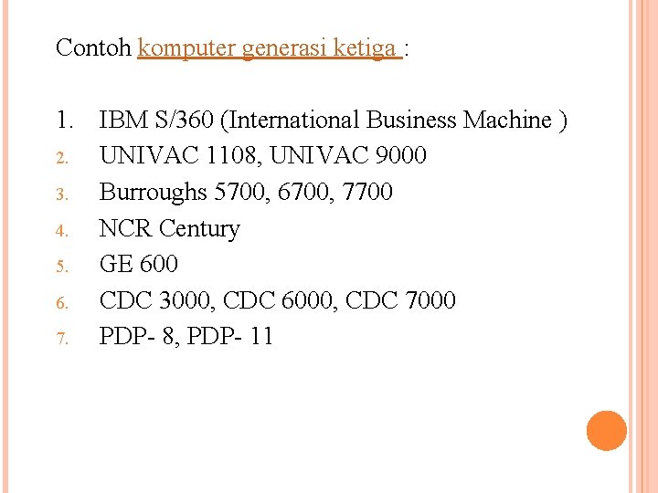 Contoh komputer generasi ketiga : 1. IBM S/360 (International Business Machine ) 2. UNIVAC 1108, UNIVAC 9000 3. Burroughs 5700, 6700, 7700 4. NCR Century 5. GE 600 6. CDC 3000, CDC 6000, CDC 7000 7. PDP- 8, PDP- 11